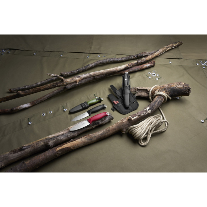 Oštrica je full tang te ima drop point oblik koja omogućuje precizan rad sa drvetom. Korice na vrhu imaju rupicu kako bi lakše raspuhale žar i zapalile vatru. Također imaju na sebi remen za nošenje.