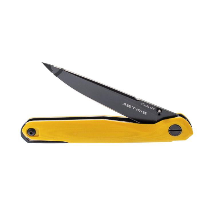 Mr.Blade Astris je elegantni nožić sa oštricom u D2 čeliku (crna stonewashed varijanta), a drške su G10 žute boje. Sa stražnje strane drške postoji utor za vezicu.