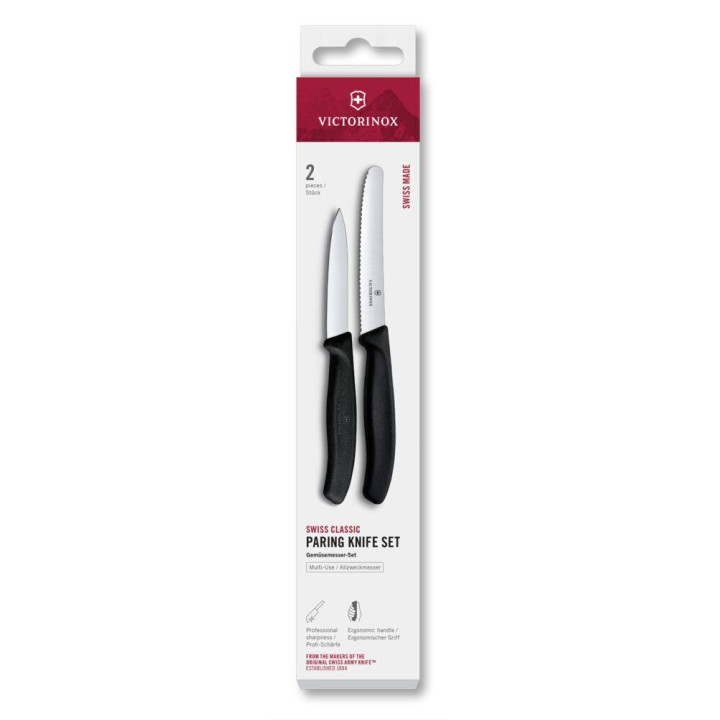 Victorinox set kuhinjskih nožića crne boje drške, a sastoji se od malog ravnog paring nožića oštrice dužine 8cm i noža za rajčice i pizzu nazubljene oštrice od 11cm i oblog vrha.