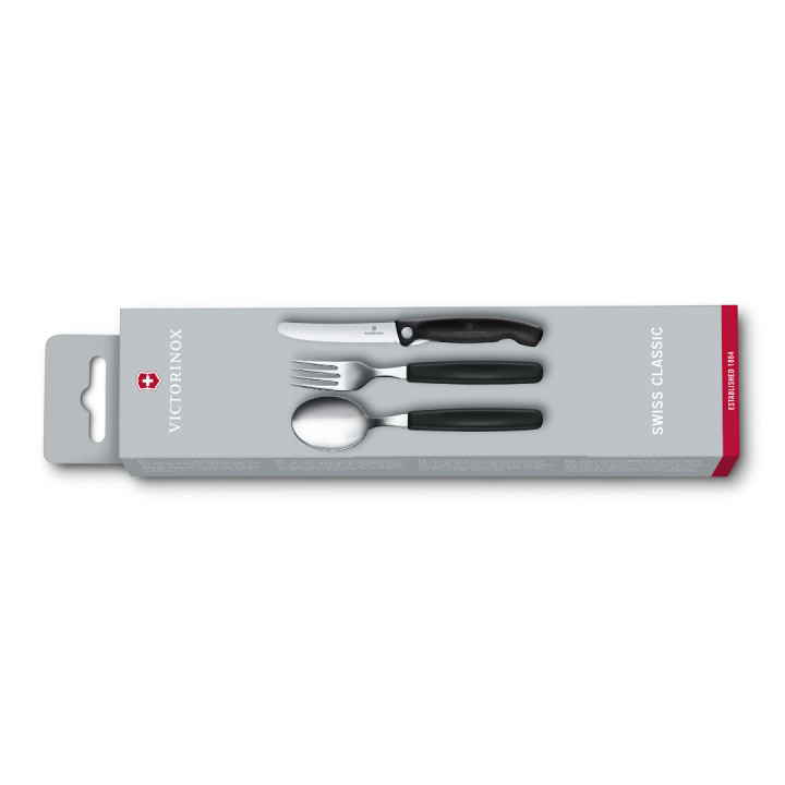 Victorinox Swiss Classic set se sastoji od preklopnog nazubljenog nožića, vilice i žlice. Idealan je za sve koji borave u prirodi ili na poslu vole imati svoj pribor za jelo.